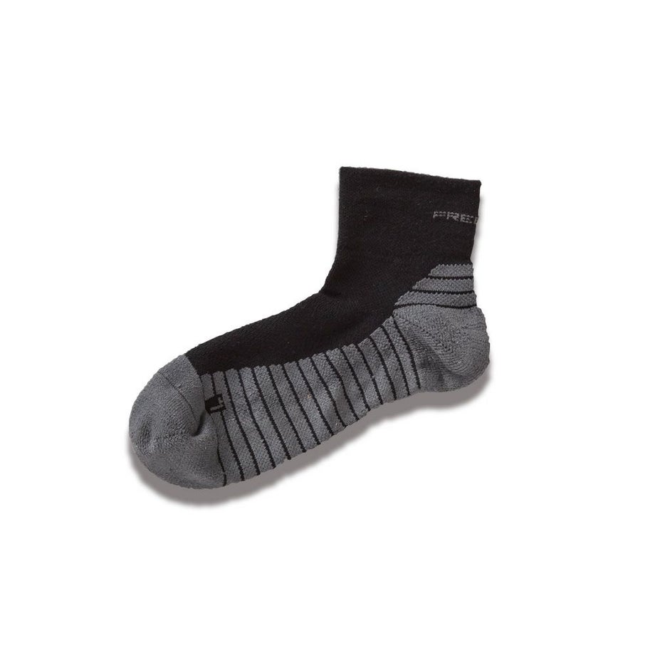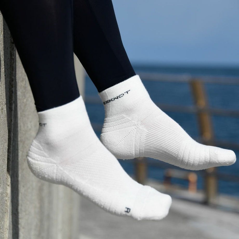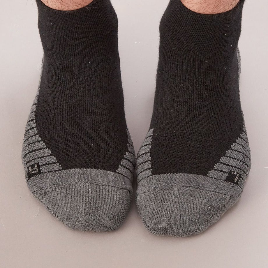 ●ソールのボーダー形状により足への密着性を高めてズレを防止。また速乾性に優れた糸(Y字断面)を使用し肌にまとわりつく感覚を軽減。