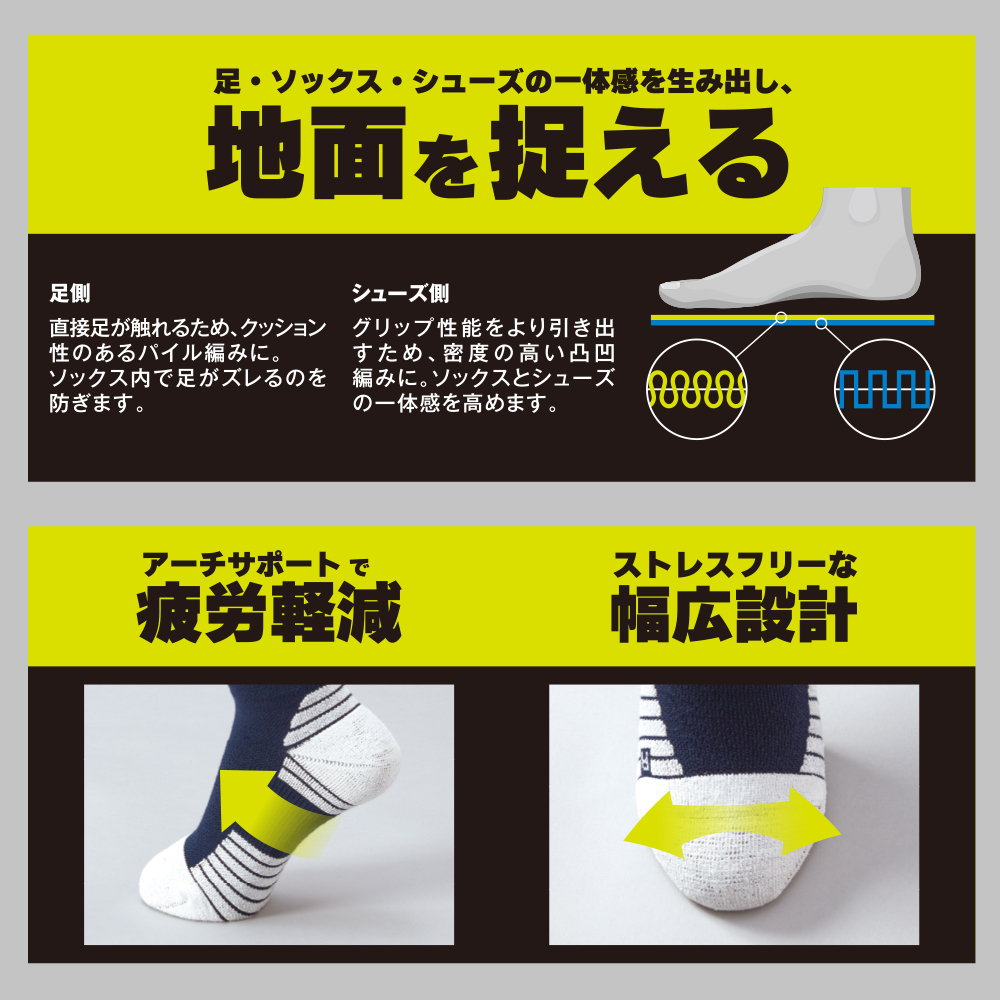 ●『ピタッと、ズレない。』そして足全体のズレるを無くすグリップソックス。