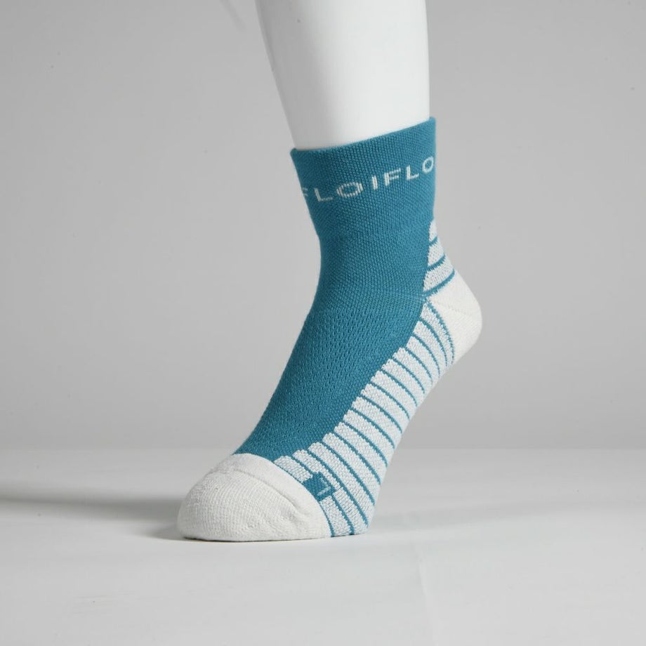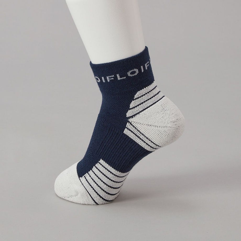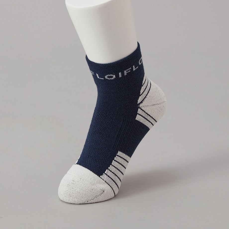 ●ソールのボーダー形状により足への密着性を高めてズレを防止。また速乾性に優れた糸(Y字断面)を使用し肌にまとわりつく感覚を軽減。