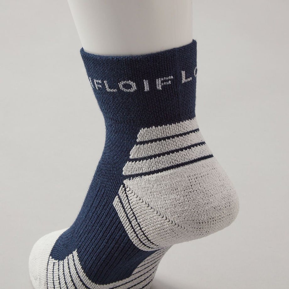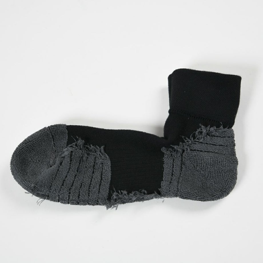 ●一般的なシリコンプリントではなく、特殊な機能性編地『モリグリップ』を採用。マイクロファイバーの滑りにくい特性を最大限発揮させた機能性編地です。足との接地面にはパイル構造の生地。シューズとの接地面には凹凸構造の生地。