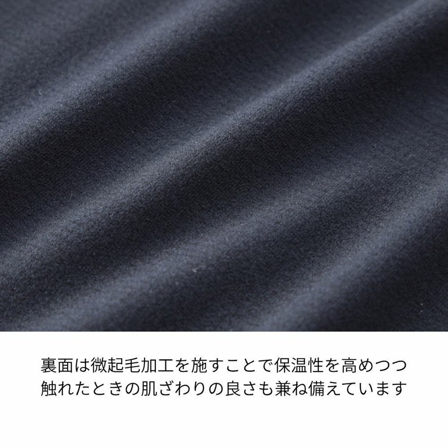 縫製糸には導電性糸を使用し、静電気の発生を抑制。生地同士の貼りつきや脱ぎ着の際のパチパチとした不快感を軽減。冬場の着心地の向上に効果的です。